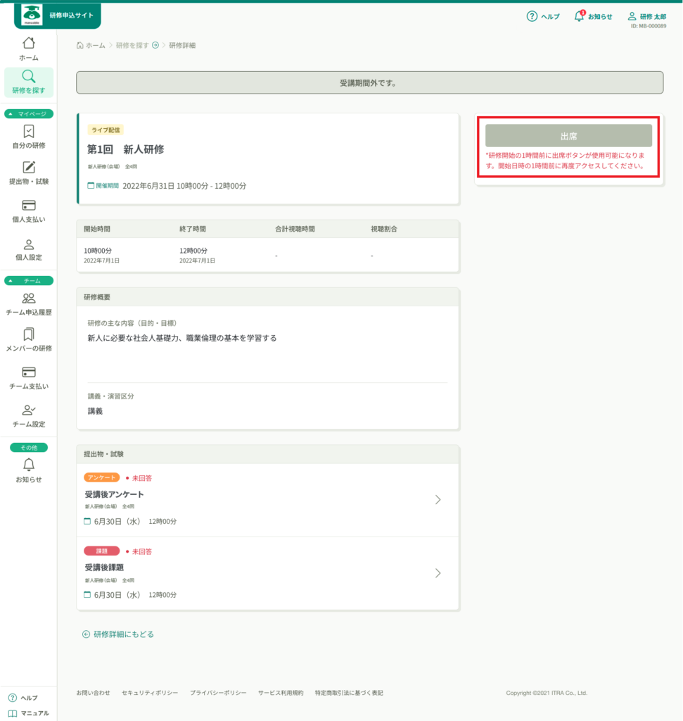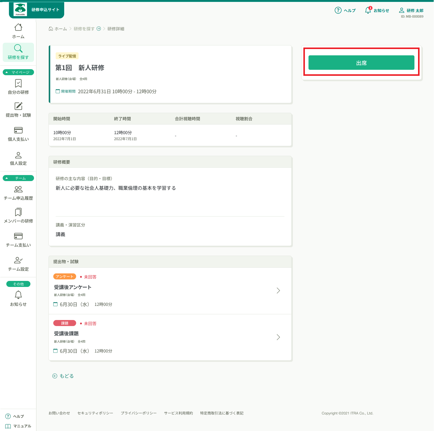 「受講」ボタンをクリックすると、「出席」ボタンが表示されます。この「出席」ボタンをクリックすると、Zoom等のライブ配信ツールが立ち上がり、ライブ配信研修を受講することができます。