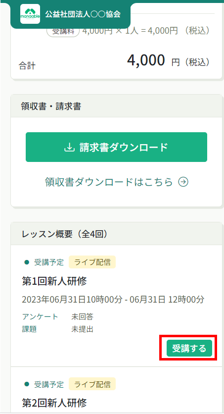 受講するレッスンの右側に表示されている「受講する」ボタンをクリックしてください。