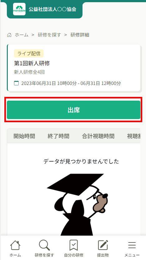 まだ出席をしていない場合、もしくは研修開催団体が出席時間の自動取得を行っていない場合には、「データが見つかりませんでした」と表示されます。