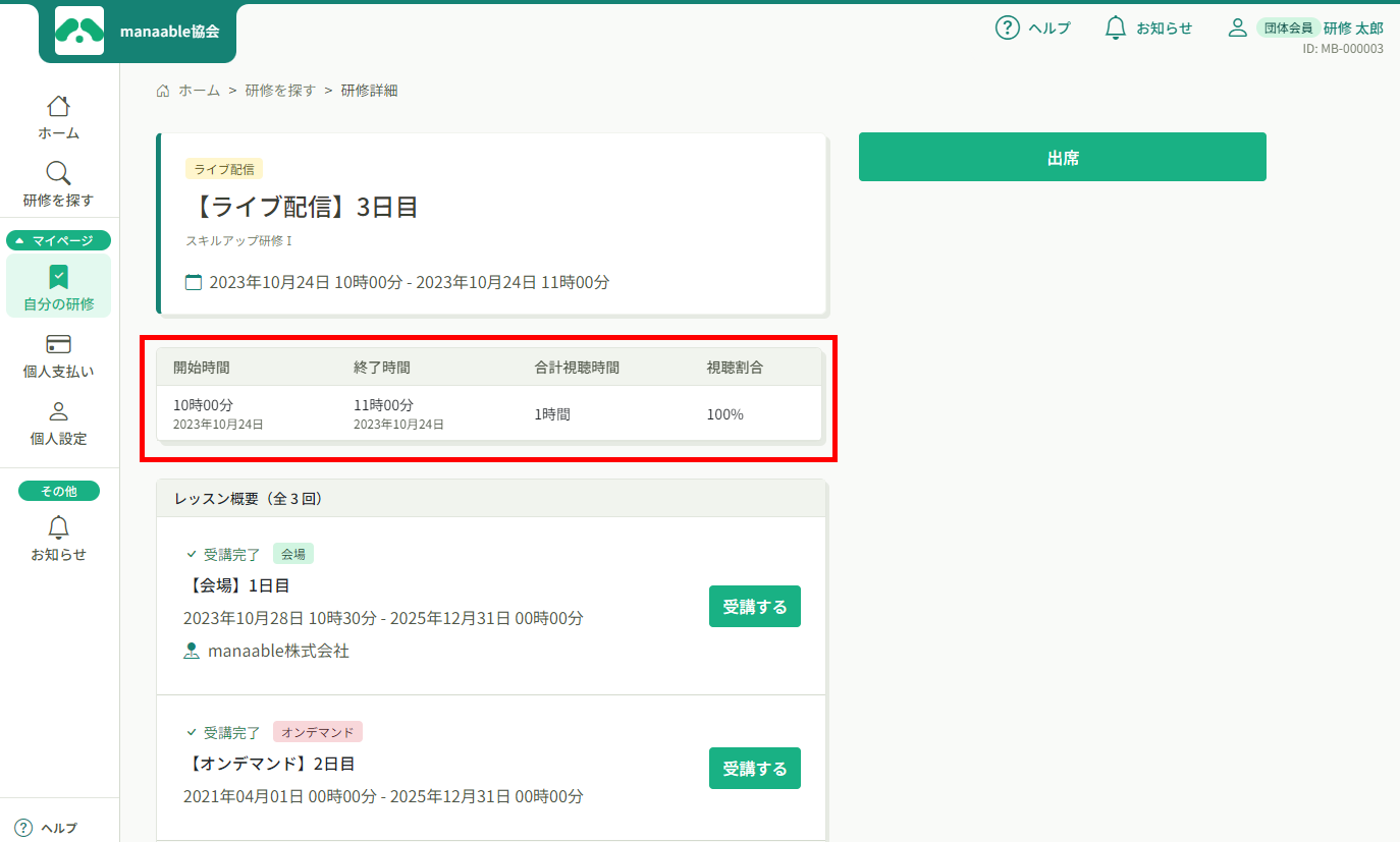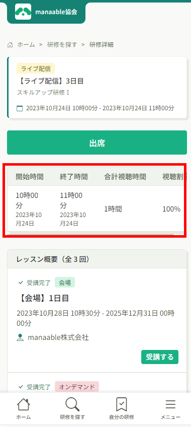 受講履歴は研修詳細のページから確認することができます。参加した研修が視聴時間まで自動で取得する研修であれば視聴した時間と視聴割合が表示されます。